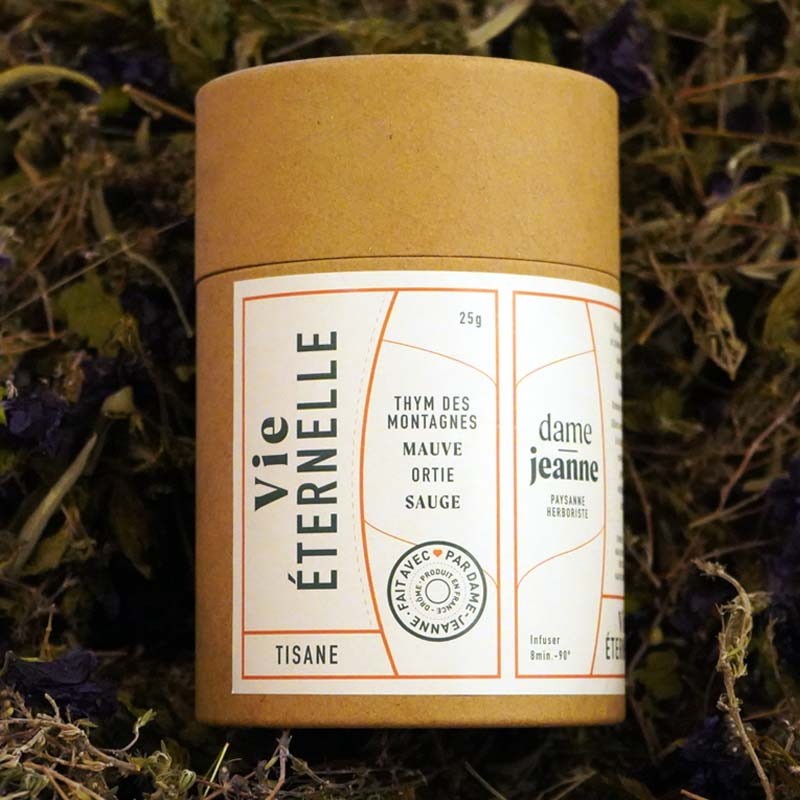 Tisane biologique produite en Drôme, un mélange de Thym des montagnes, Mauve, Ortie et Sauge.